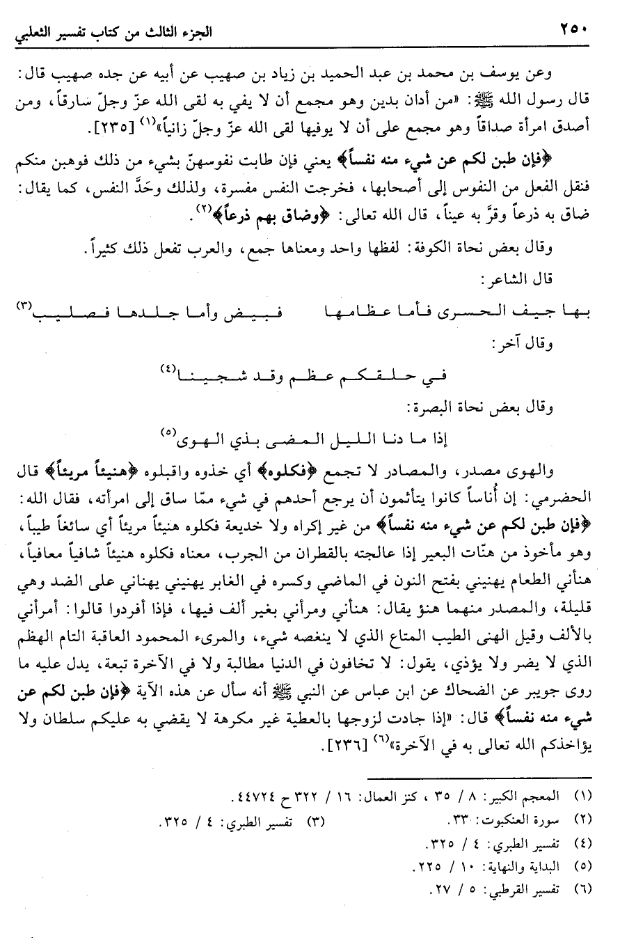 روى جويبر عن الضحاك عن ابن عباس عن النبي صلّى الله عليه وسلّم أنه سأل عن هذه الآية فَإِنْ طِبْنَ لَكُمْ عَنْ شَيْءٍ مِنْهُ نَفْساً قال: «إذا جادت لزوجها بالعطية غير مكرهة لا يقضي به عليكم سلطان ولا يؤاخذكم الله تعالى به في الآخرة» «6» [236] .