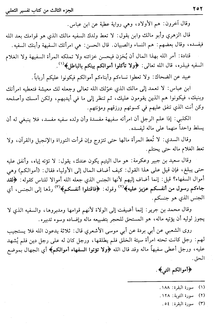 قال الزهري وأبو مالك وابن يقول: لا تعط ولدك السفيه مالك الذي هو قوامك بعد الله فيفسده، وقال بعضهم: هم النساء والصبيان. قال الحسن: هي امرأتك السفيهة وابنك السفيه.
