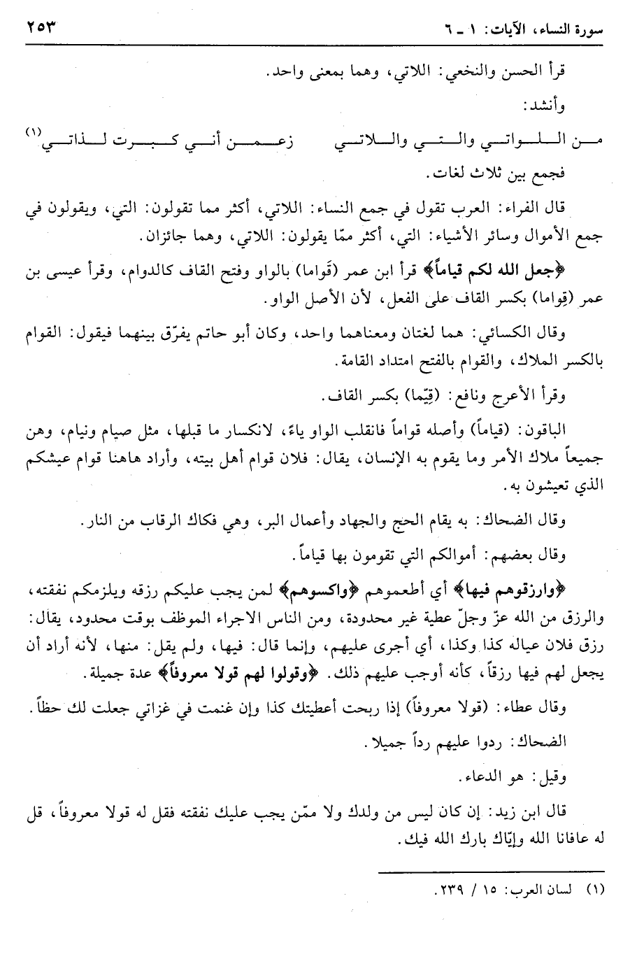 جَعَلَ اللَّهُ لَكُمْ قِياماً قرأ ابن عمر (قَواما) بالواو وفتح القاف كالدوام، وقرأ عيسى بن عمر (قِواما) بكسر القاف على الفعل، لأن الأصل الواو.