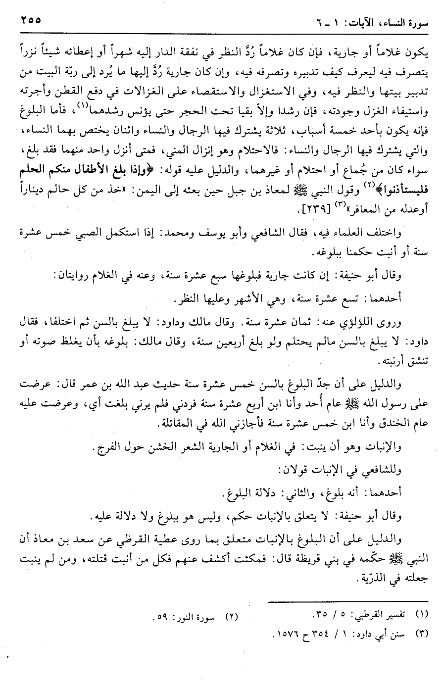 واختلف العلماء فيه، فقال الشافعي وأبو يوسف ومحمد: إذا استكمل الصبي خمس عشرة سنة أو أنبت حكمنا ببلوغه.
