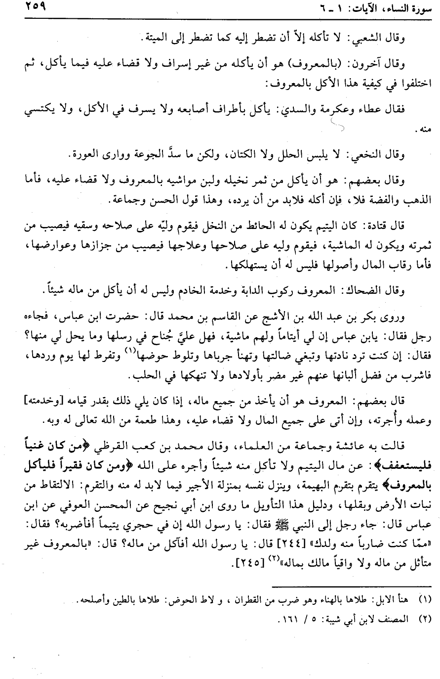 قال قتادة: كان اليتيم يكون له الحائط من النخل فيقوم وليّه على صلاحه وسقيه فيصيب من ثمرته ويكون له الماشية، فيقوم وليه على صلاحها وعلاجها فيصيب من جزازها وعوارضها، فأما رقاب المال وأصولها فليس له أن يستهلكها.