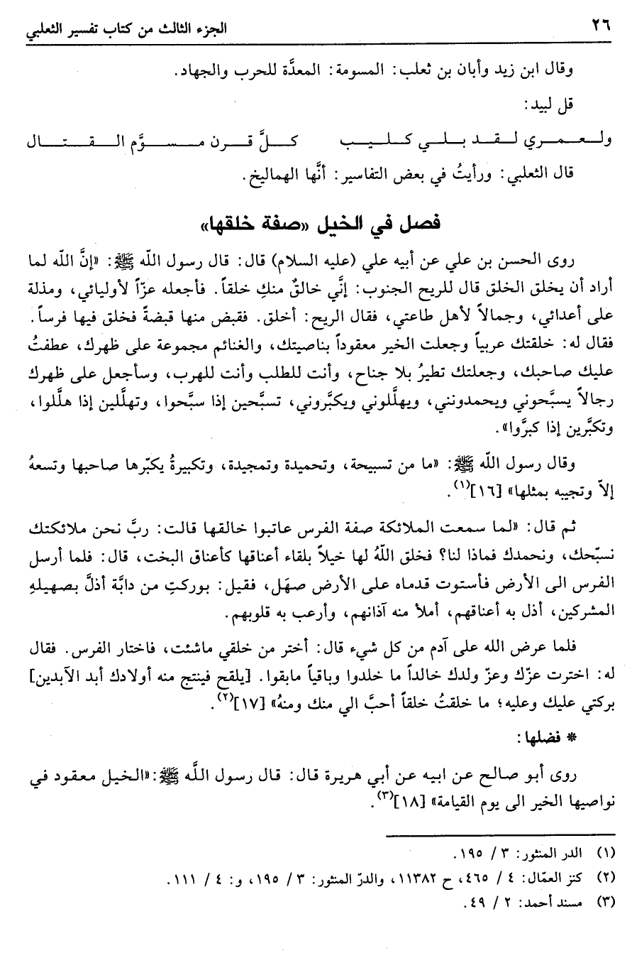 روى أبو صالح عن أبيه عن أبي هريرة قال: قال رسول الله صلّى الله عليه وسلّم: «الخيل معقود في نواصيها الخير الى يوم القيامة» [18] «3» .