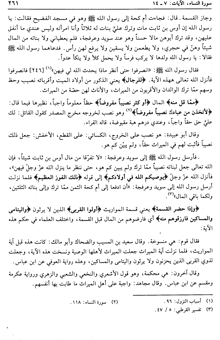 فأرسل رسول الله صلّى الله عليه وسلّم إلى سويد وعرفجة: «لا تفرّقا من مال أوس بن ثابت شيئا، فإن الله تعالى جعل لبناته نصيبا ممّا ترك ولم يبين كم هو، حتى ننظر ما ينزل الله عزّ وجلّ فيهن» ، فأنزل الله عزّ وجلّ يُوصِيكُمُ اللَّهُ فِي أَوْلادِكُمْ إلى قوله ذلِكَ الْفَوْزُ الْعَظِيمُ فلما نزلت أرسل رسول الله إلى سويد وعرفجة: «أن ادفعا إلى أم كحة الثمن ممّا ترك وإلى بناته الثلثين، ولكما باقي المال» «3» .