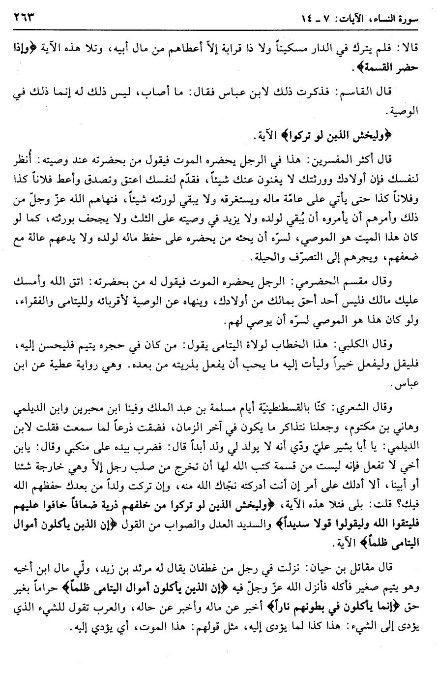 وقال الشعري: كنّا بالقسطنطينيّة أيام مسلمة بن عبد الملك وفينا ابن محبرين وابن الديلمي وهاني بن مكتوم، وجعلنا نتذاكر ما يكون في آخر الزمان، فضقت ذرعا لما سمعت فقلت لابن الديلمي: يا أبا بشير عليّ ودّي أنه لا يولد لي ولد أبدا قال: فضرب بيده على منكبي وقال: يا ابن أخي لا تفعل فإنه ليست من قسمة كتب الله لها أن تخرج من صلب رجل إلّا وهي خارجة شئنا أو أبينا، ألا أدلك على أمر إن أنت أدركته نجّاك الله منه، وإن تركت ولدا من بعدك حفظهم الله فيك؟ قلت: بلى فتلا هذه الآية، وَلْيَخْشَ الَّذِينَ لَوْ تَرَكُوا مِنْ خَلْفِهِمْ ذُرِّيَّةً ضِعافاً خافُوا عَلَيْهِمْ فَلْيَتَّقُوا اللَّهَ وَلْيَقُولُوا قَوْلًا سَدِيداً والسديد العدل والصواب من القول إِنَّ الَّذِينَ يَأْكُلُونَ أَمْوالَ الْيَتامى ظُلْماً الآية.