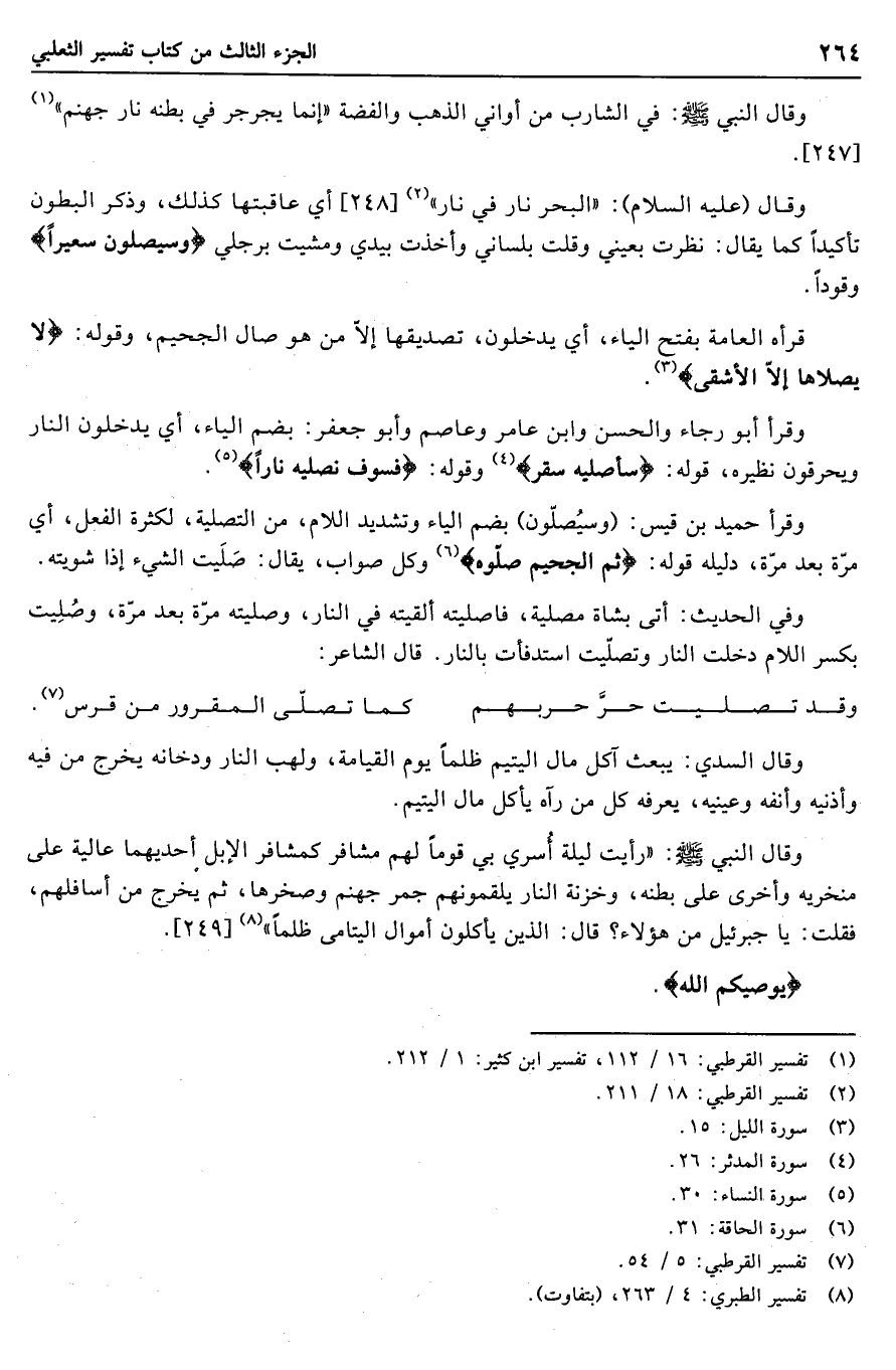 وقال النبي صلّى الله عليه وسلّم: «رأيت ليلة أسري بي قوما لهم مشافر كمشافر الإبل إحداهما عالية على منخريه وأخرى على بطنه، وخزنة النار يلقمونهم جمر جهنم وصخرها، ثم يخرج من أسافلهم، فقلت: يا جبرئيل من هؤلاء؟ قال: الَّذِينَ يَأْكُلُونَ أَمْوالَ الْيَتامى ظُلْماً» «8» [249] .