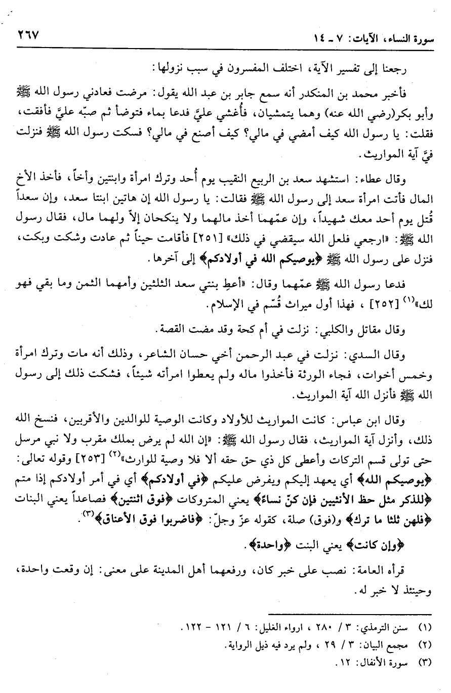 وقال عطاء: استشهد سعد بن الربيع النقيب يوم أحد وترك امرأة وابنتين وأخا، فأخذ الأخ المال فأتت امرأة سعد إلى رسول الله صلّى الله عليه وسلّم فقالت: يا رسول الله إن هاتين ابنتا سعد، وإن سعدا قتل يوم أحد معك شهيدا، وإن عمّهما أخذ مالهما ولا ينكحان إلّا ولهما مال، فقال رسول الله صلّى الله عليه وسلّم: «ارجعي فلعل الله سيقضي في ذلك» [251] فأقامت حينا ثم عادت وشكت وبكت، فنزل على رسول الله صلّى الله عليه وسلّم يُوصِيكُمُ اللَّهُ فِي أَوْلادِكُمْ إلى آخرها.