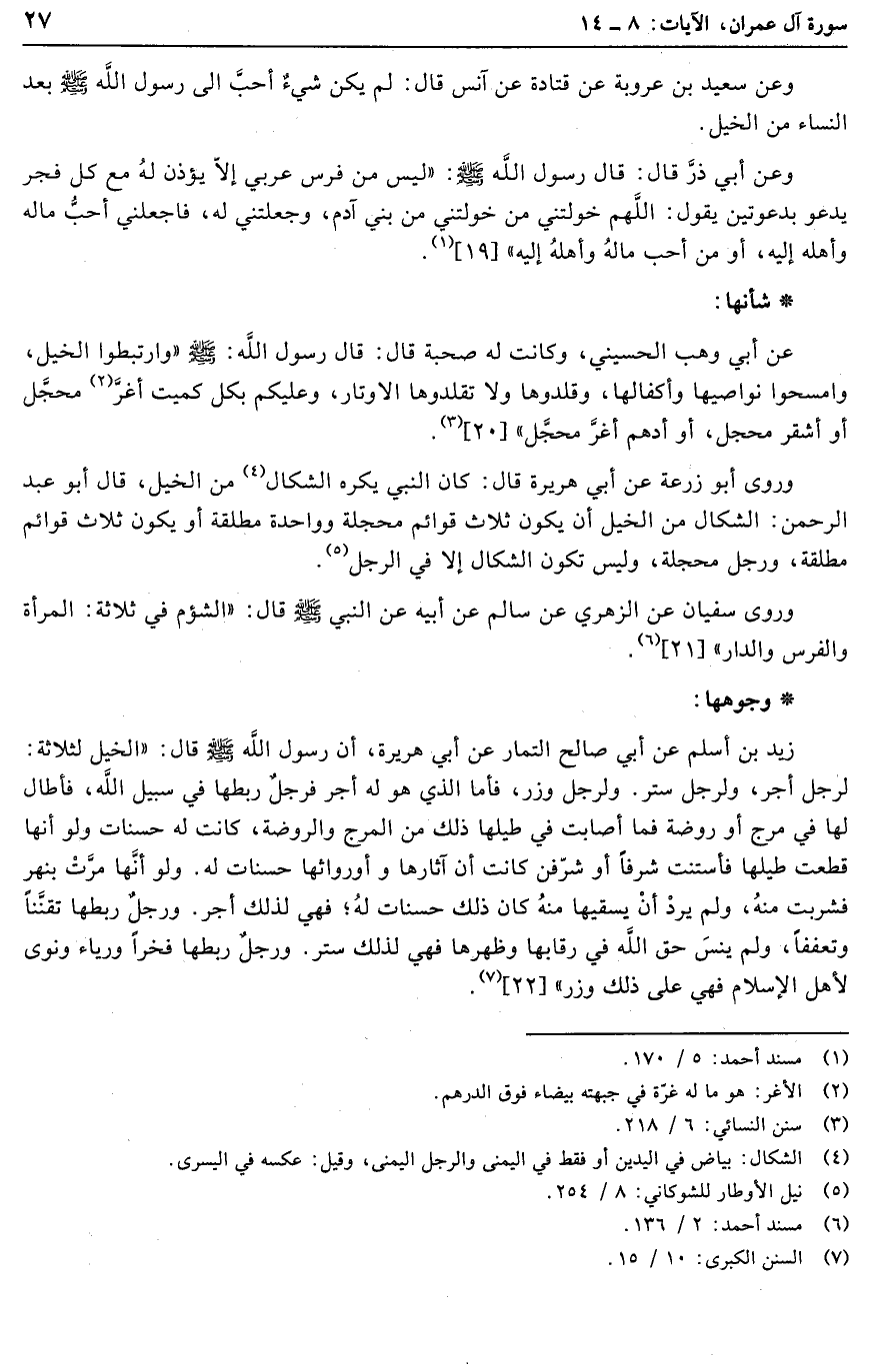 وعن سعيد بن عروبة عن قتادة عن آنس قال: لم يكن شيء أحبّ الى رسول الله صلى الله عليه وسلّم بعد النساء من الخيل.