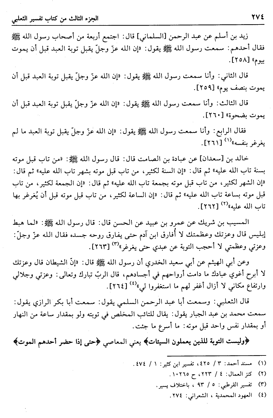 زيد بن أسلم عن عبد الرحمن [السلماني] قال: اجتمع أربعة من أصحاب رسول الله صلّى الله عليه وسلّم فقال أحدهم: سمعت رسول الله صلّى الله عليه وسلّم يقول: «إن الله عزّ وجلّ يقبل توبة العبد قبل أن يموت بيوم» [258] .