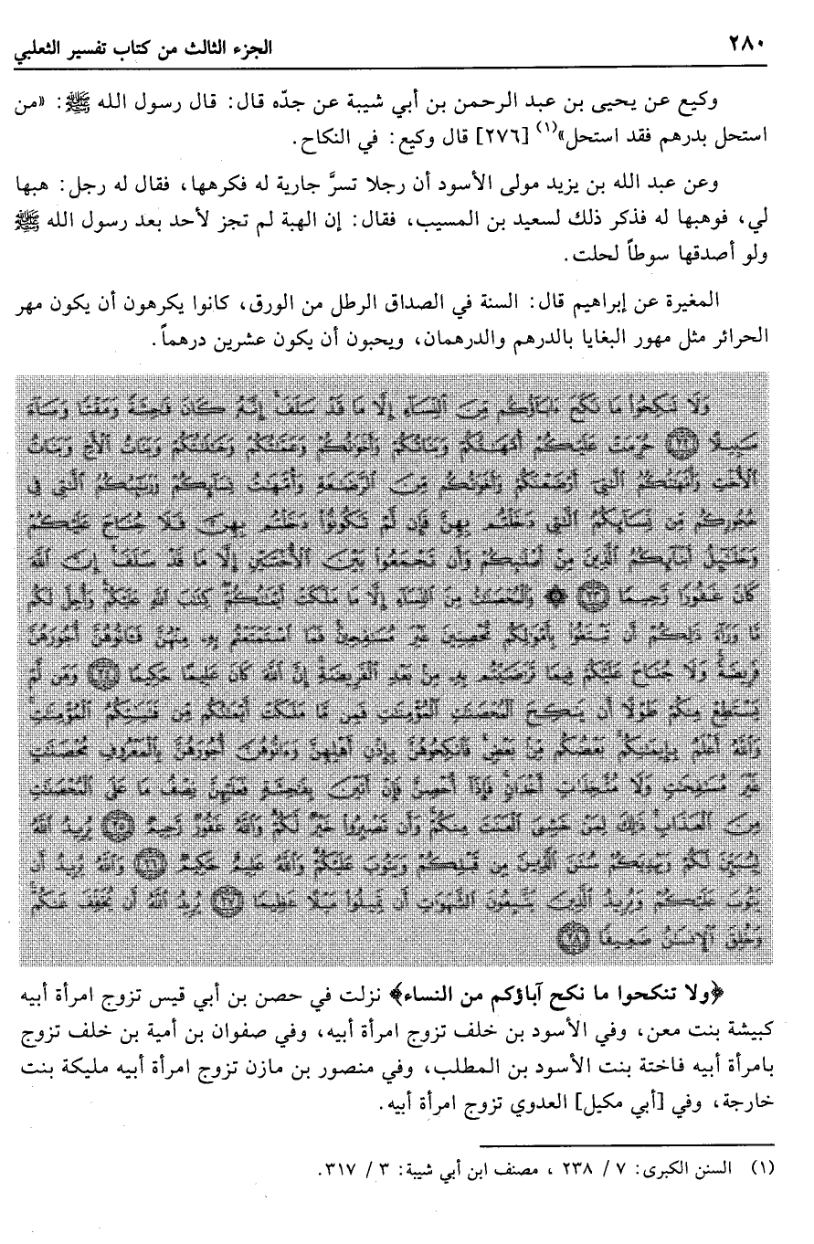 وَلا تَنْكِحُوا ما نَكَحَ آباؤُكُمْ مِنَ النِّساءِ إِلاَّ ما قَدْ سَلَفَ إِنَّهُ كانَ فاحِشَةً وَمَقْتاً وَساءَ سَبِيلاً (22) حُرِّمَتْ عَلَيْكُمْ أُمَّهاتُكُمْ وَبَناتُكُمْ وَأَخَواتُكُمْ وَعَمَّاتُكُمْ وَخالاتُكُمْ وَبَناتُ الْأَخِ وَبَناتُ الْأُخْتِ وَأُمَّهاتُكُمُ اللاَّتِي أَرْضَعْنَكُمْ وَأَخَواتُكُمْ مِنَ الرَّضاعَةِ وَأُمَّهاتُ نِسائِكُمْ وَرَبائِبُكُمُ اللاَّتِي فِي حُجُورِكُمْ مِنْ نِسائِكُمُ اللاَّتِي دَخَلْتُمْ بِهِنَّ فَإِنْ لَمْ تَكُونُوا دَخَلْتُمْ بِهِنَّ فَلا جُناحَ عَلَيْكُمْ وَحَلائِلُ أَبْنائِكُمُ الَّذِينَ مِنْ أَصْلابِكُمْ وَأَنْ تَجْمَعُوا بَيْنَ الْأُخْتَيْنِ إِلاَّ ما قَدْ سَلَفَ إِنَّ اللَّهَ كانَ غَفُوراً رَحِيماً (23) وَالْمُحْصَناتُ مِنَ النِّساءِ إِلاَّ ما مَلَكَتْ أَيْمانُكُمْ كِتابَ اللَّهِ عَلَيْكُمْ وَأُحِلَّ لَكُمْ ما وَراءَ ذلِكُمْ أَنْ تَبْتَغُوا بِأَمْوالِكُمْ مُحْصِنِينَ غَيْرَ مُسافِحِينَ فَمَا اسْتَمْتَعْتُمْ بِهِ مِنْهُنَّ فَآتُوهُنَّ أُجُورَهُنَّ فَرِيضَةً وَلا جُناحَ عَلَيْكُمْ فِيما تَراضَيْتُمْ بِهِ مِنْ بَعْدِ الْفَرِيضَةِ إِنَّ اللَّهَ كانَ عَلِيماً حَكِيماً (24) وَمَنْ لَمْ يَسْتَطِعْ مِنْكُمْ طَوْلاً أَنْ يَنْكِحَ الْمُحْصَناتِ الْمُؤْمِناتِ فَمِنْ ما مَلَكَتْ أَيْمانُكُمْ مِنْ فَتَياتِكُمُ الْمُؤْمِناتِ وَاللَّهُ أَعْلَمُ بِإِيمانِكُمْ بَعْضُكُمْ مِنْ بَعْضٍ فَانْكِحُوهُنَّ بِإِذْنِ أَهْلِهِنَّ وَآتُوهُنَّ أُجُورَهُنَّ بِالْمَعْرُوفِ مُحْصَناتٍ غَيْرَ مُسافِحاتٍ وَلا مُتَّخِذاتِ أَخْدانٍ فَإِذا أُحْصِنَّ فَإِنْ أَتَيْنَ بِفاحِشَةٍ فَعَلَيْهِنَّ نِصْفُ ما عَلَى الْمُحْصَناتِ مِنَ الْعَذابِ ذلِكَ لِمَنْ خَشِيَ الْعَنَتَ مِنْكُمْ وَأَنْ تَصْبِرُوا خَيْرٌ لَكُمْ وَاللَّهُ غَفُورٌ رَحِيمٌ (25) يُرِيدُ اللَّهُ لِيُبَيِّنَ لَكُمْ وَيَهْدِيَكُمْ سُنَنَ الَّذِينَ مِنْ قَبْلِكُمْ وَيَتُوبَ عَلَيْكُمْ وَاللَّهُ عَلِيمٌ حَكِيمٌ (26)