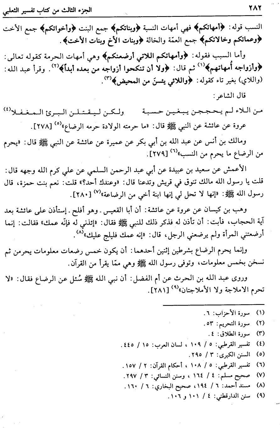 النسب قوله: أُمَّهاتُكُمْ فهي أمهات النسبة وَبَناتُكُمْ جمع البنت وَأَخَواتُكُمْ جمع الأخت وَعَمَّاتُكُمْ وَخالاتُكُمْ جمع العمّة والخالة وَبَناتُ الْأَخِ وَبَناتُ الْأُخْتِ.