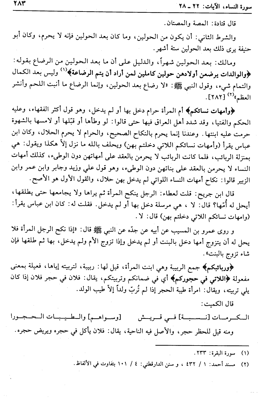 وَأُمَّهاتُ نِسائِكُمْ أم المرأة حرام دخل بها أو لم يدخل، وهو قول أكثر الفقهاء، وعليه الحكم والفتيا، وقد شدد أهل العراق فيها حتى قالوا: لو وطأها أو قبّلها أو لامسها بالشهوة حرمت عليه ابنتها. وعندنا إنما يحرم بالنكاح الصحيح، والحرام لا يحرم الحلال، وكان ابن عباس يقرأ (وأمهات نسائكم اللاتي دخلتم بهن) ويحلف بالله ما نزل إلّا هكذا ويقول: هي بمنزلة الربائب، فلما كانت الربائب لا يحرمن بالعقد على أمهاتهن دون الوطء، كذلك أمهات النساء لا يحرمن بالعقد على بناتهن دون الوطء، وهو