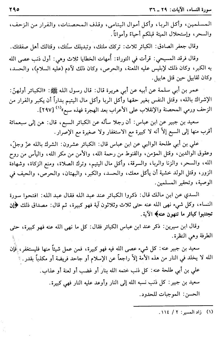 السدي عن ابن مالك قال: ذكروا الكبائر عند عبد الله فقال عبد الله: افتحوا سورة النساء، وكل شيء نهى الله عنه حتى ثلاث وثلاثون آية فهو كبيرة، ثم قال: مصداق ذلك إِنْ تَجْتَنِبُوا كَبائِرَ ما تُنْهَوْنَ عَنْهُ الآية.