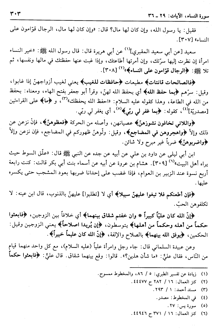 فقيل: يا رسول الله، وإن كان لها مال؟ قال: «وإن كان لها مال، الرِّجالُ قَوَّامُونَ عَلَى النِّساءِ» [307] .