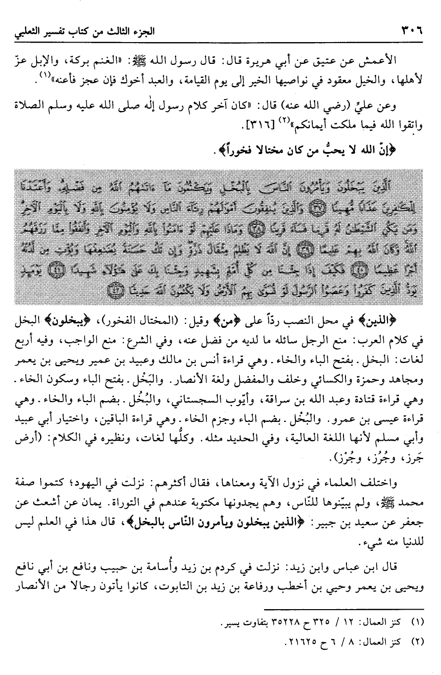 الَّذِينَ في محل النصب ردّا على مَنْ وقيل: (المختال الفخور) ، يَبْخَلُونَ البخل في كلام العرب: منع الرجل سائله ما لديه من فضل عنه، وفي الشرع: منع الواجب، وفيه أربع لغات: البخل- بفتح الباء والخاء- وهي قراءة أنس بن مالك وعبيد بن عمير ويحيى بن يعمر ومجاهد وحمزة والكسائي وخلف والمفضل ولغة الأنصار. والبخل- بفتح الباء وسكون الخاء- وهي قراءة قتادة وعبد الله بن سراقة، وأيّوب السجستاني، والبخل- بضم الباء والخاء- وهي قراءة عيسى بن عمرو. والبخل- بضم الباء وجزم الخاء- وهي قراءة الباقين، واختيار أبي عبيد وأبي مسلم لأنها اللغة العالية، وفي الحديد مثله. وكلّها لغات، ونظيره في الكلام: (أرض جرز، وجرز، وجرز) .