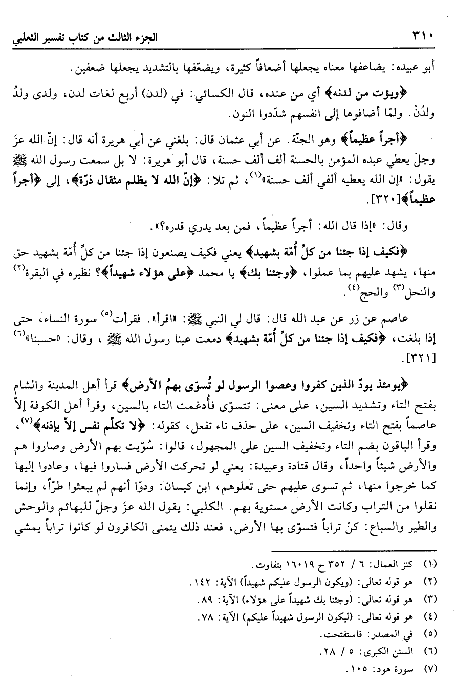 عن أبي عثمان قال: بلغني عن أبي هريرة أنه قال: إنّ الله عزّ وجلّ يعطي عبده المؤمن بالحسنة ألف ألف حسنة، قال أبو هريرة: لا بل سمعت رسول الله صلّى الله عليه وسلّم يقول: «إن الله يعطيه ألفي ألف حسنة» «1» ، ثم تلا: إِنَّ اللَّهَ لا يَظْلِمُ مِثْقالَ ذَرَّةٍ، إلى أَجْراً عَظِيماً [320] .