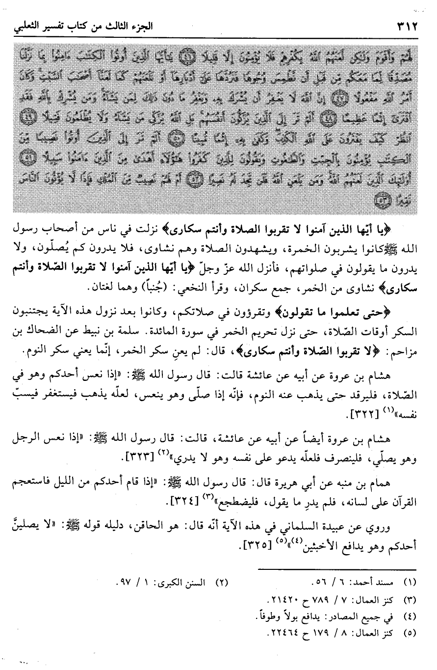 يا أَيُّهَا الَّذِينَ آمَنُوا لا تَقْرَبُوا الصَّلاةَ وَأَنْتُمْ سُكارى نزلت في ناس من أصحاب رسول الله صلّى الله عليه وسلم كانوا يشربون الخمرة، ويشهدون الصلاة وهم نشاوى، فلا يدرون كم يصلّون، ولا يدرون ما يقولون في صلواتهم، فأنزل الله عزّ وجلّ يا أَيُّهَا الَّذِينَ آمَنُوا لا تَقْرَبُوا الصَّلاةَ وَأَنْتُمْ سُكارى نشاوى من الخمر، جمع سكران، وقرأ النخعي: (جنبا) وهما لغتان.