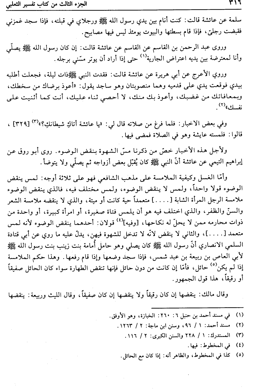 وأمّا الغسل وكيفية الملامسة على مذهب الشافعي فهو على ثلاثة أوجه: لمس ينقض الوضوء قولا واحدا، ولمس لا ينقض الوضوء، ولمس مختلف فيه، فالذي ينقض الوضوء ملامسة الرجل المرأة الشابة [ ... ] متعمدا حية كانت أو ميتة، والذي لا ينقضه ملامسة الشعر والسنّ والظفر، والذي اختلف فيه هو أن يلمس فتاة صغيرة، أو امرأة كبيرة، أو واحدة من ذوات محارمه ممن لا يحلّ له نكاحها، [وفيه] «4» قولان: أحد هما ينقض الوضوء لأنه لمس متعمد [....] ، والثاني لا ينقض لأنّه لا تدخل للشهوة فيهن، يدلّ عليه ما