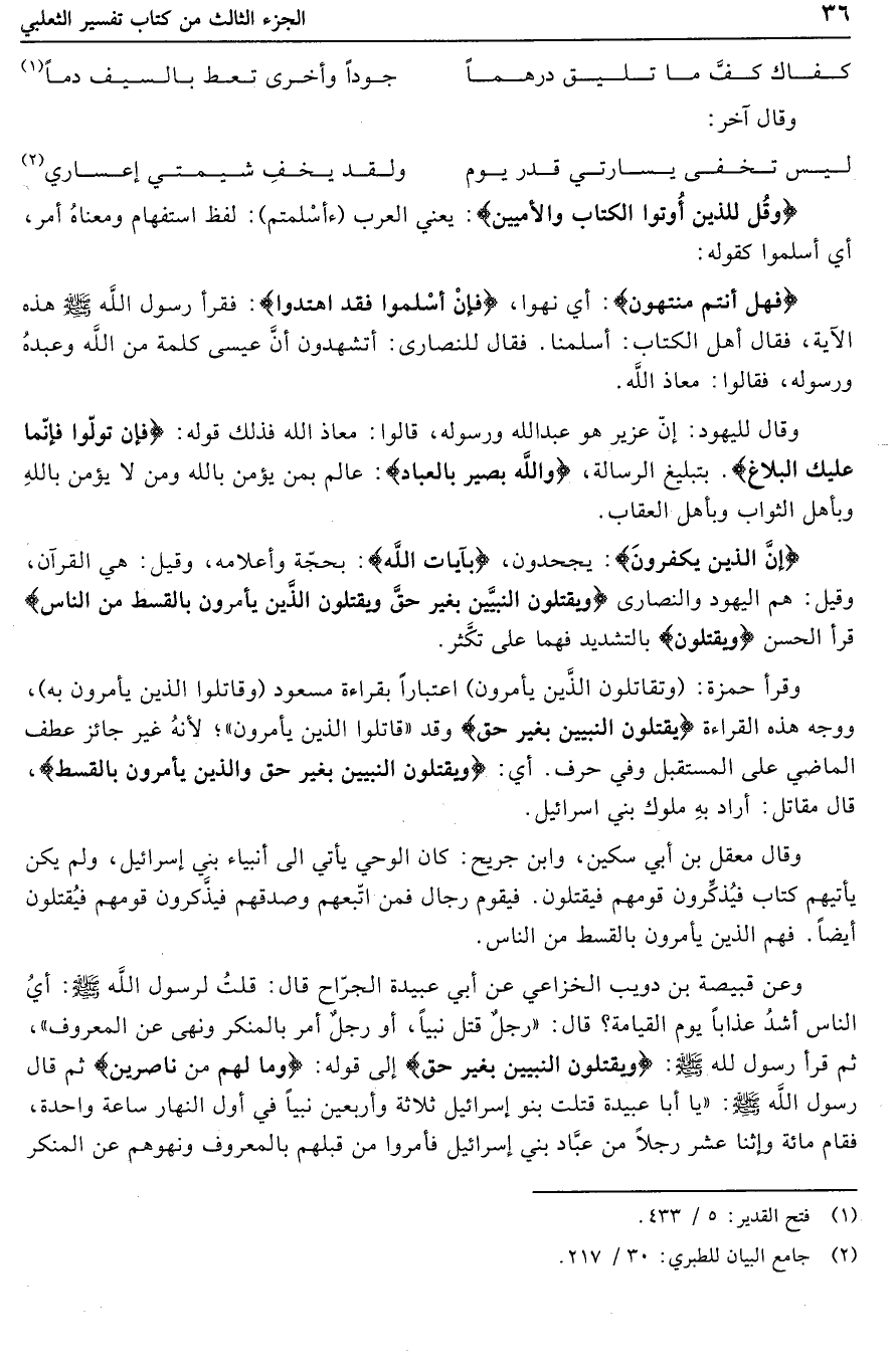 وعن قبيصة بن دويب الخزاعي عن أبي عبيدة الجرّاح قال: قلت لرسول الله صلّى الله عليه وسلّم: أي الناس أشد عذابا يوم القيامة؟ قال: «رجل قتل نبيا، أو رجل أمر بالمنكر ونهى عن المعروف» ، ثم قرأ رسول الله صلّى الله عليه وسلّم: وَيَقْتُلُونَ النَّبِيِّينَ بِغَيْرِ حَقٍّ إلى قوله: وَما لَهُمْ مِنْ ناصِرِينَ ثم قال رسول الله صلّى الله عليه وسلّم: «يا أبا عبيدة قتلت بنو إسرائيل ثلاثة وأربعين نبيا في أول النهار ساعة واحدة، فقام مائة وإثنا عشر رجلا من عبّاد بني إسرائيل فأمروا من قبلهم بالمعروف ونهوهم عن المنكر