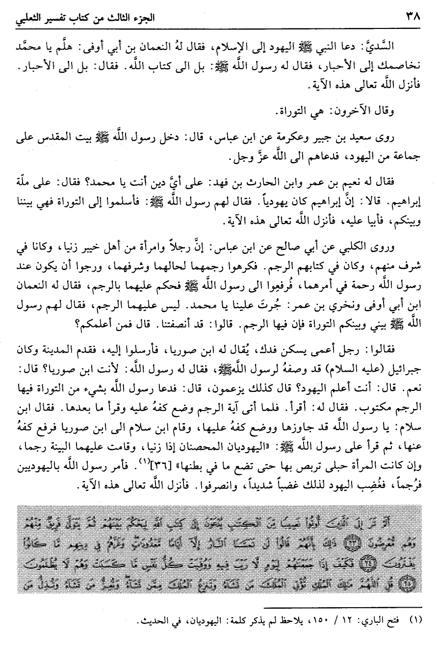 وروى الكلبي عن أبي صالح عن ابن عباس: إنّ رجلا وامرأة من أهل خيبر زنيا، وكانا في شرف منهم، وكان في كتابهم الرجم. فكرهوا رجمهما لحالهما وشرفهما، ورجوا أن يكون عند رسول الله رحمة في أمرهما، فرفعوا الى رسول الله صلّى الله عليه وسلّم فحكم عليهما بالرجم، فقال له النعمان ابن أبي أوفى ونخري بن عمر: جرت علينا يا محمد. ليس عليهما الرجم، فقال لهم رسول الله صلّى الله عليه وسلّم بيني وبينكم التوراة فإن فيها الرجم. قالوا: قد أنصفتنا. قال فمن أعلمكم؟
