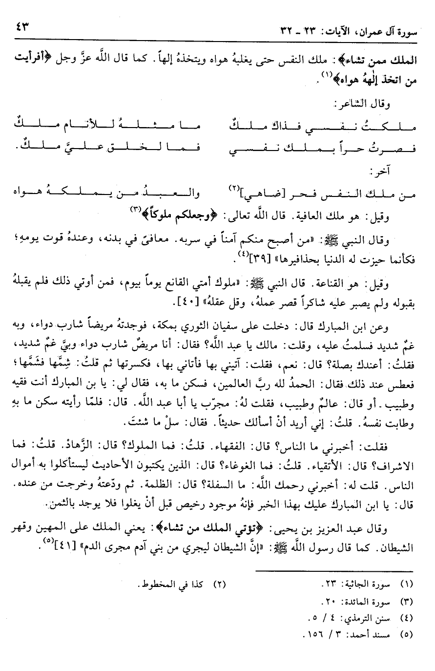 من ملك النفس فحر [ضاهي] «2» ... والعبد من يملكه هواه
