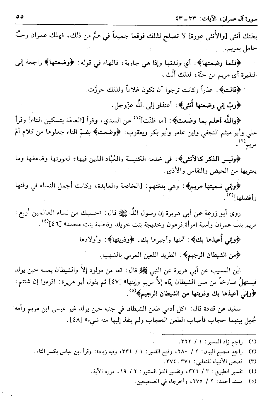 ابن المسيب عن أبي هريرة عن النبي صلّى الله عليه وسلّم قال: «ما من مولود إلّا والشيطان يمسه حين يولد فيستهل صارخا من مس الشيطان إيّاه إلّا مريم وابنها» [47] ثم يقول أبو هريرة: اقرءوا إن شئتم: