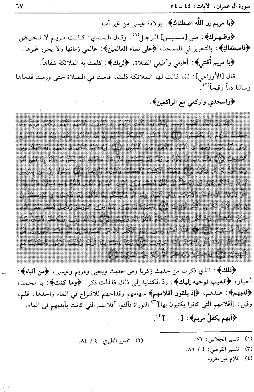 ذلِكَ مِنْ أَنْباءِ الْغَيْبِ نُوحِيهِ إِلَيْكَ وَما كُنْتَ لَدَيْهِمْ إِذْ يُلْقُونَ أَقْلامَهُمْ أَيُّهُمْ يَكْفُلُ مَرْيَمَ وَما كُنْتَ لَدَيْهِمْ إِذْ يَخْتَصِمُونَ (44) إِذْ قالَتِ الْمَلائِكَةُ يا مَرْيَمُ إِنَّ اللَّهَ يُبَشِّرُكِ بِكَلِمَةٍ مِنْهُ اسْمُهُ الْمَسِيحُ عِيسَى ابْنُ مَرْيَمَ وَجِيهاً فِي الدُّنْيا وَالْآخِرَةِ وَمِنَ الْمُقَرَّبِينَ (45) وَيُكَلِّمُ النَّاسَ فِي الْمَهْدِ وَكَهْلاً وَمِنَ الصَّالِحِينَ (46) قالَتْ رَبِّ أَنَّى يَكُونُ لِي وَلَدٌ وَلَمْ يَمْسَسْنِي بَشَرٌ قالَ كَذلِكِ اللَّهُ يَخْلُقُ ما يَشاءُ إِذا قَضى أَمْراً فَإِنَّما يَقُولُ لَهُ كُنْ فَيَكُونُ (47) وَيُعَلِّمُهُ الْكِتابَ وَالْحِكْمَةَ وَالتَّوْراةَ وَالْإِنْجِيلَ (48)