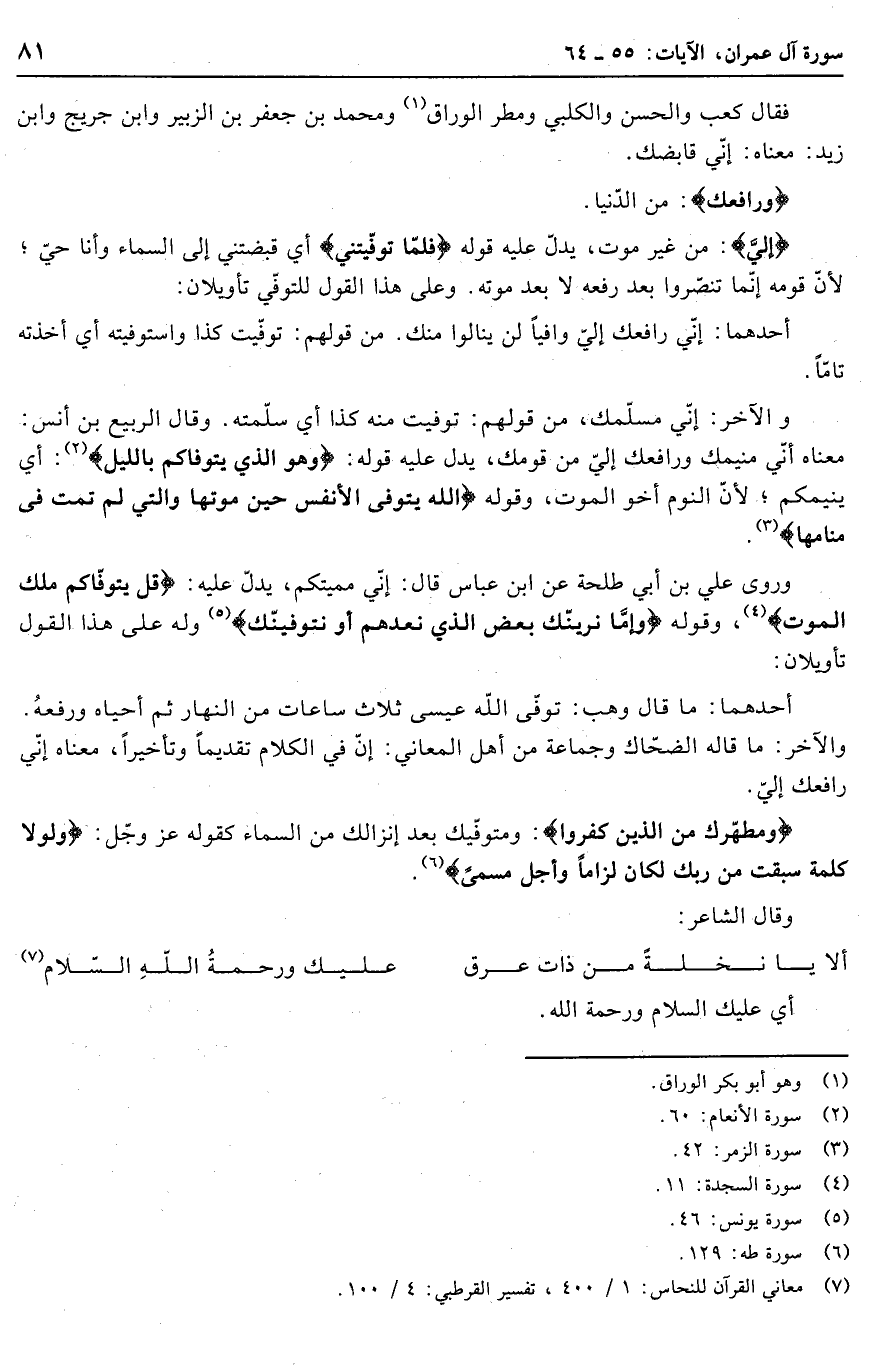 وروى علي بن أبي طلحة عن ابن عباس قال: إنّي مميتكم، يدلّ عليه: قُلْ يَتَوَفَّاكُمْ مَلَكُ الْمَوْتِ «4» ، وقوله وَإِمَّا نُرِيَنَّكَ بَعْضَ الَّذِي نَعِدُهُمْ أَوْ نَتَوَفَّيَنَّكَ «5» وله على هذا القول تأويلان: