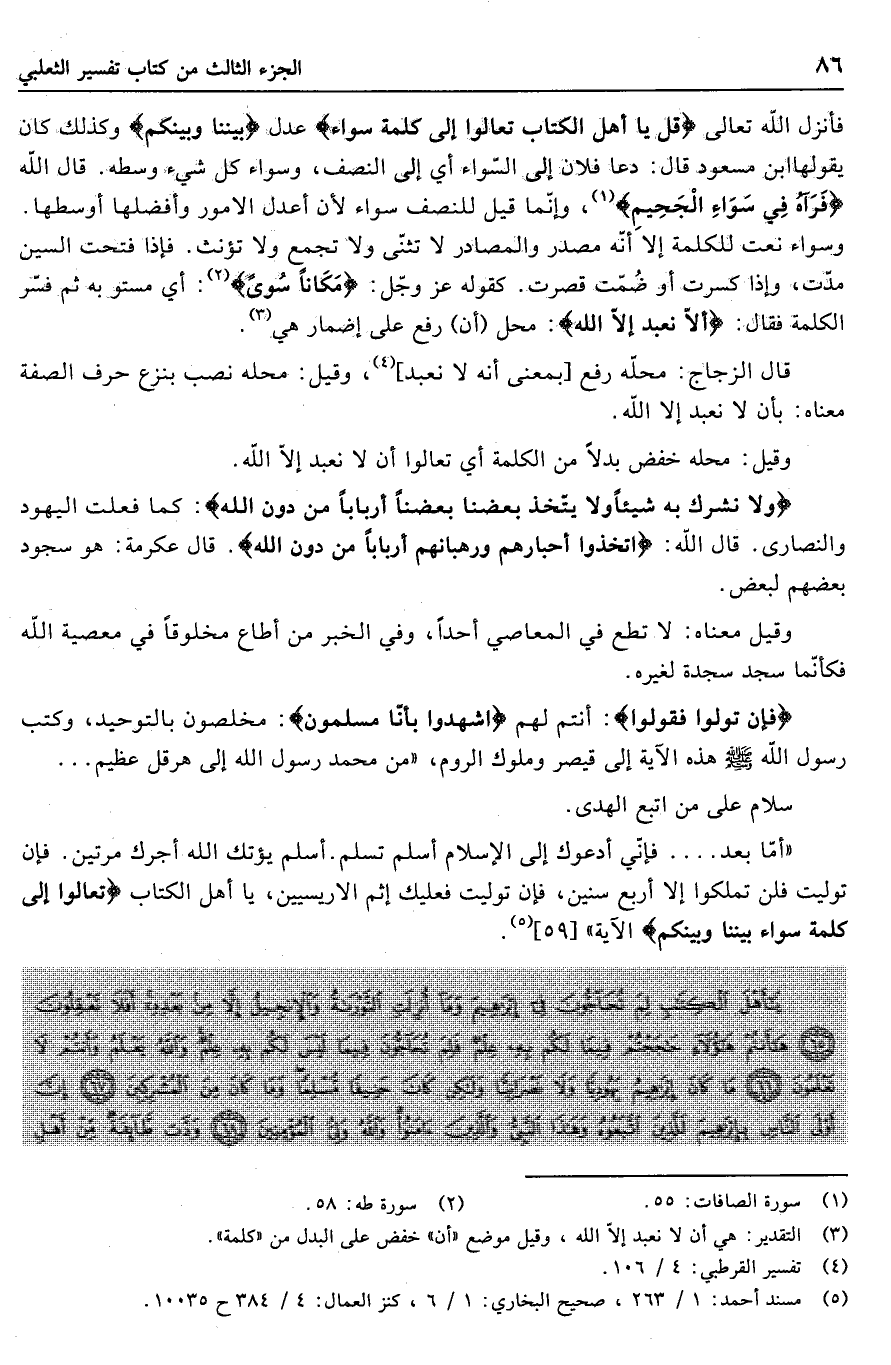 فأنزل الله تعالى قُلْ يا أَهْلَ الْكِتابِ تَعالَوْا إِلى كَلِمَةٍ سَواءٍ عدل بَيْنَنا وَبَيْنَكُمْ