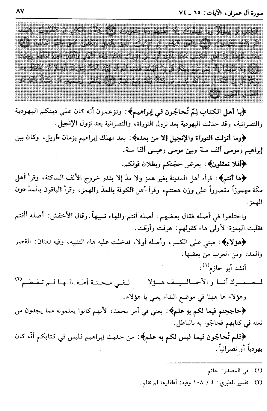 فَلِمَ تُحَاجُّونَ فِيما لَيْسَ لَكُمْ بِهِ عِلْمٌ: من حديث إبراهيم فليس في كتابكم أنّه كان يهوديا أو نصرانيا.