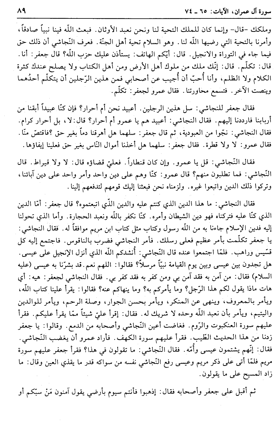 فقال النجاشي: ما هذا الدين الذي كنتم عليه والدين الّذي اتبعتموه؟ قال جعفر: أمّا الدين الذي كنّا عليه فتركناه فهو دين الشيطان وأمره. كنّا نكفر بالله ونعبد الحجارة. وأما الذي تحولنا إليه فدين الإسلام جاءنا به من الله رسول وكتاب مثل كتاب ابن مريم موافقا له. فقال النجاشي: