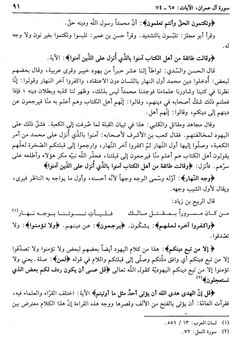وقال مجاهد ومقاتل والكلبي: هذا في تبيان القبلة لما صرفت إلى الكعبة. فشقّ ذلك على اليهود لمخالفتهم. فقال كعب بن الأشرف لأصحابه: آمنوا بالّذي أنزل على محمد من أمر الكعبة، وصلّوا إليها أول النّهار ثمّ اكفروا آخر النّهار، وارجعوا إلى قبلتكم الصّخرة لعلّهم يقولون أهل الكتاب هم أعلم منّا فيرجعون إلى قبلتنا، فحذّر الله نبيّه مكر هؤلاء وأطلعه على سرّهم. فأنزل: وَقالَتْ طائِفَةٌ مِنْ أَهْلِ الْكِتابِ آمِنُوا بِالَّذِي أُنْزِلَ عَلَى الَّذِينَ آمَنُوا وَجْهَ النَّهارِ: أوّله وسمّي الوجه وجها لأنّه أحسنه، وأول ما يواجه به الناظر فيرى، ويقال لأول الشيب وجهه.