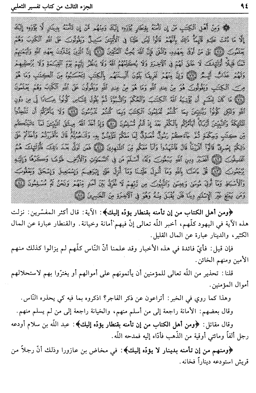 وَمِنْ أَهْلِ الْكِتابِ مَنْ إِنْ تَأْمَنْهُ بِقِنْطارٍ يُؤَدِّهِ إِلَيْكَ: الآية: قال أكثر المفسّرين: نزلت هذه الآية في اليهود كلّهم، أخبر الله تعالى إنّ فيهم أمانة وخيانة. والقنطار عبارة عن المال الكثير، والدينار عبارة عن المال القليل.