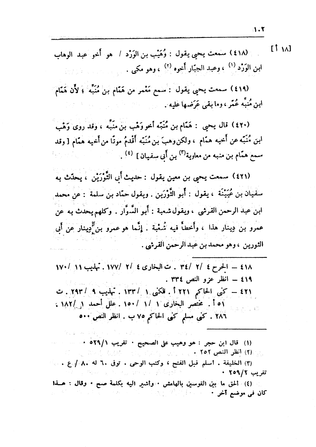 420 - قَالَ يحيى همام بن مُنَبّه أَخُو وهب بن مُنَبّه وَقد روى وهب بن مُنَبّه عَن أَخِيه همام وَلَكِن وهب بن مُنَبّه أقدم موتا من أَخِيه همام وَقد سمع همام بن مُنَبّه من مُعَاوِيَة بن أَبى سُفْيَان