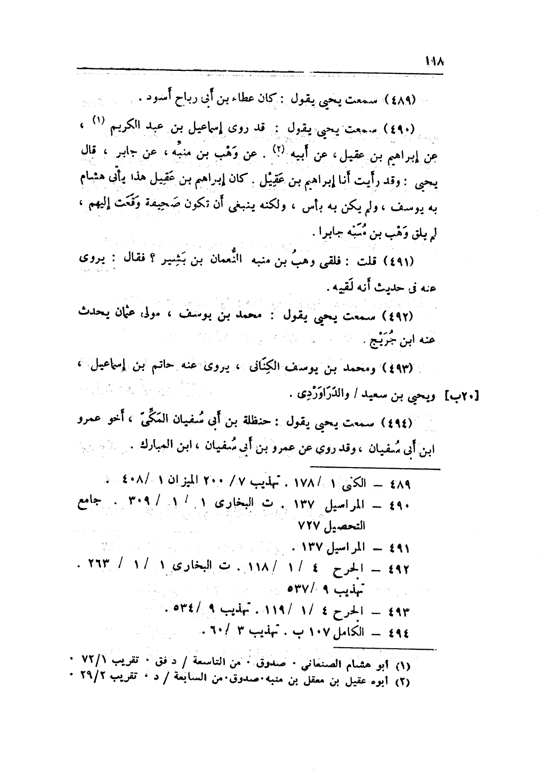 490 - سَمِعت يحيى يَقُول قد روى إِسْمَاعِيل بن عبد الْكَرِيم عَن إِبْرَاهِيم بن عقيل عَن أَبِيه عَن وهب بن مُنَبّه عَن جَابر قَالَ يحيى وَقد رَأَيْت أَنا إِبْرَاهِيم بن عقيل كَانَ إِبْرَاهِيم بن عقيل هَذَا يأتى هِشَام بِهِ يُوسُف وَلم يكن بِهِ بَأْس وَلكنه يَنْبَغِي أَن تكون صحيفَة وَقعت إِلَيْهِم لم يلق وهب بن مُنَبّه جَابِرا