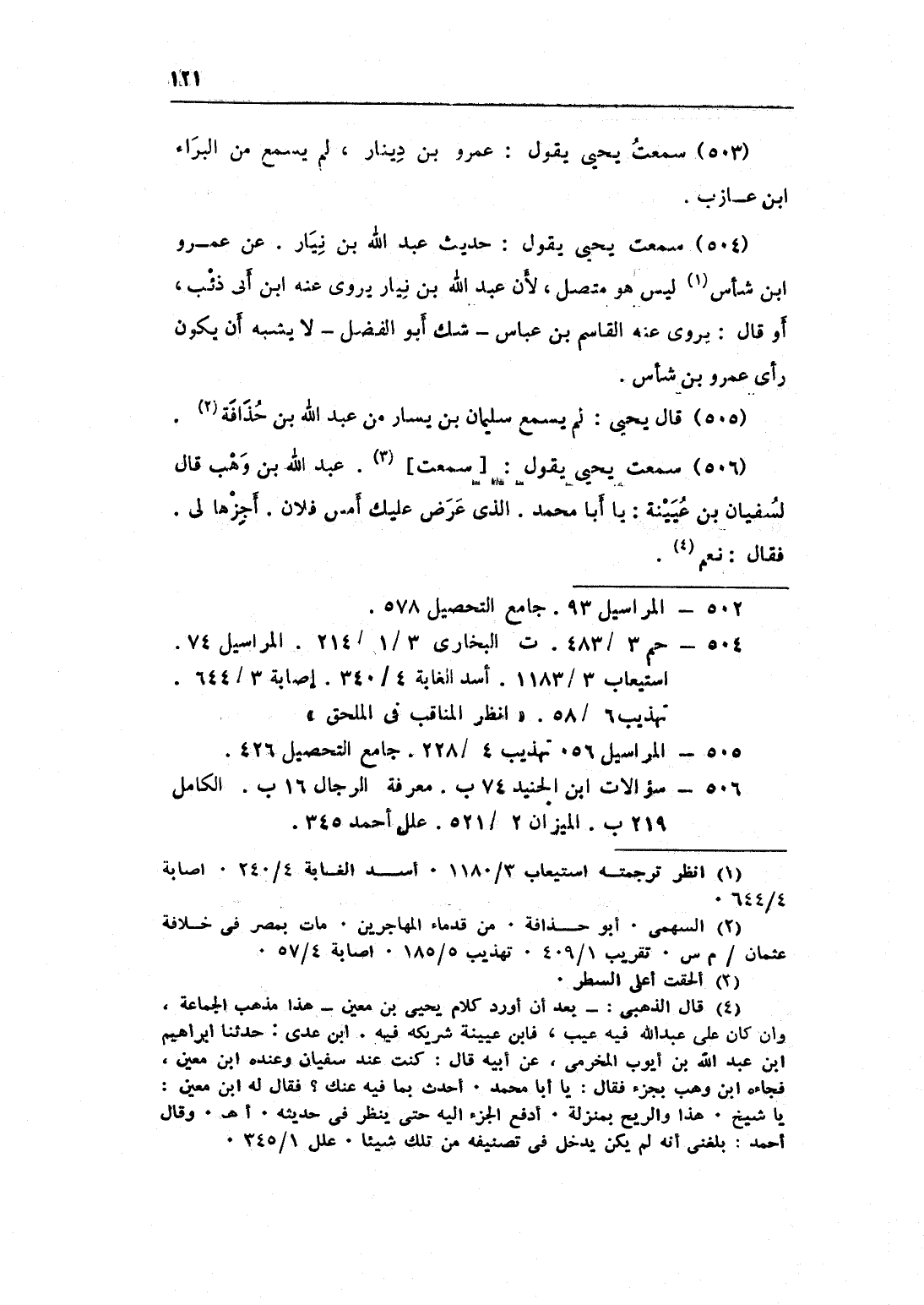504 - سَمِعت يحيى يَقُول حَدِيث عبد الله بن نيار عَن عَمْرو بن شأس لَيْسَ هُوَ مُتَّصِل لِأَن عبد الله بن نيار يرْوى عَنهُ بن أَبى ذِئْب أَو قَالَ يرْوى عَنهُ الْقَاسِم بن عَبَّاس شكّ أَبُو الْفضل لَا يشبه أَن يكون رأى عَمْرو بن شأس