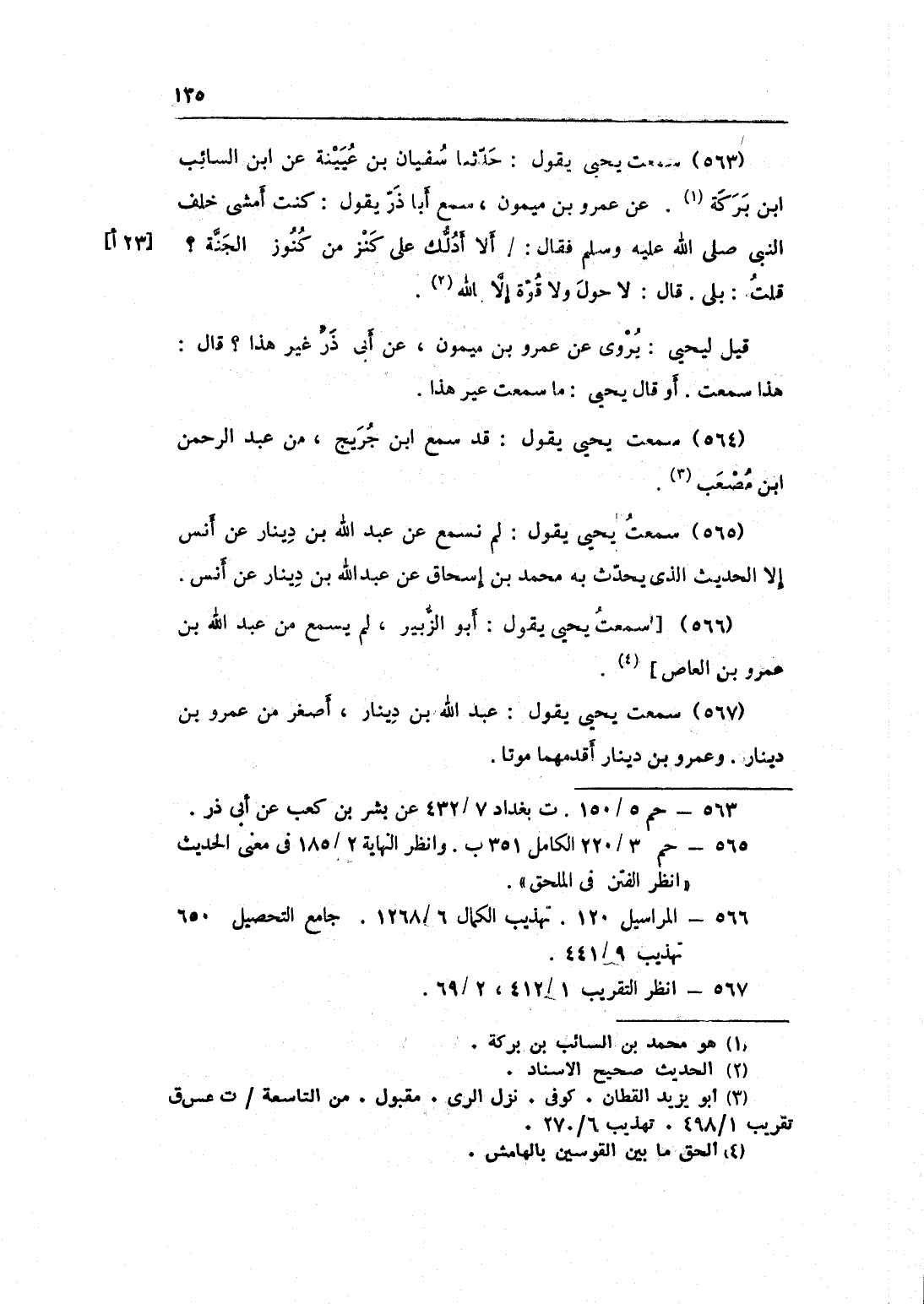563 - سَمِعت يحيى يَقُول حَدثنَا سُفْيَان بن عُيَيْنَة عَن بن السَّائِب بن بركَة عَن عَمْرو بن مَيْمُون سمع أَبَا ذَر يَقُول كنت أَمْشِي خلف النَّبِي صلى الله عَلَيْهِ وَسلم فَقَالَ أَلا أدلك على كنز من كنوز الْجنَّة قلت بلَى قَالَ لَا حول وَلَا قُوَّة إِلَّا بِاللَّه قيل ليحيى يرْوى عَن عَمْرو بن مَيْمُون عَن أَبى ذَر غير هَذَا قَالَ هَذَا سَمِعت أَو قَالَ يحيى مَا سَمِعت غير هَذَا