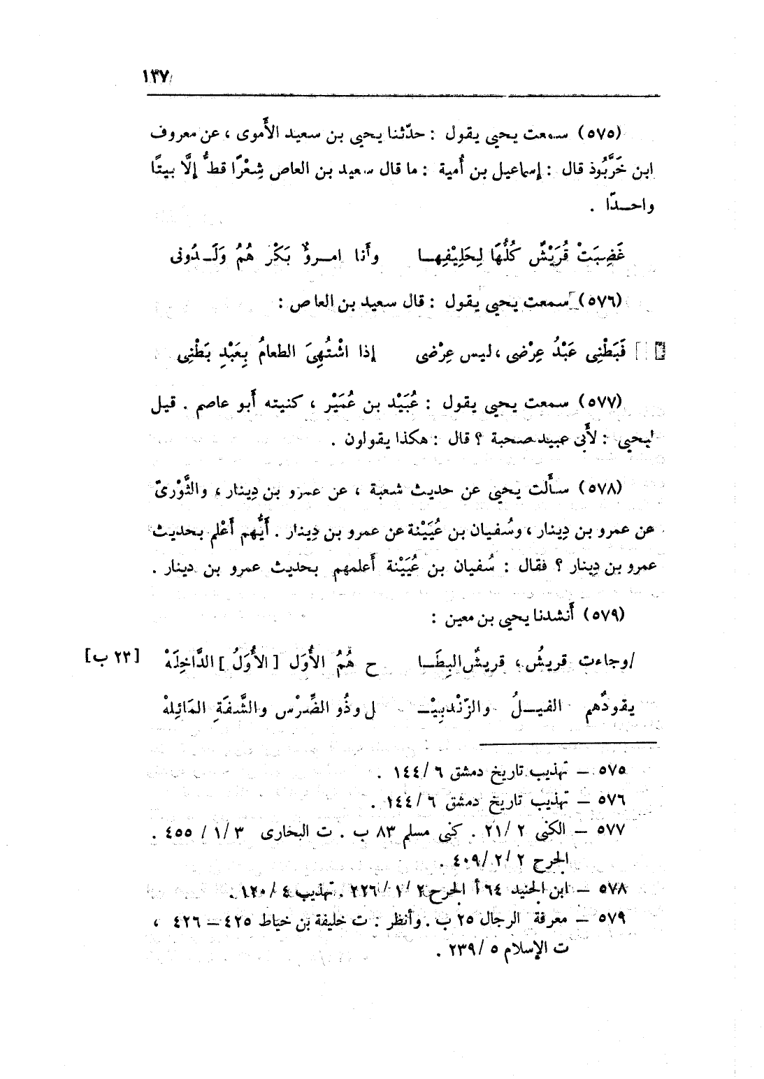 575 - سَمِعت يحيى يَقُول حَدثنَا يحيى بن سعيد الْأمَوِي عَن مَعْرُوف بن خَرَّبُوذ قَالَ إِسْمَاعِيل بن أُميَّة مَا قَالَ سعيد بن الْعَاصِ شعرًا قطّ إِلَّا بَيْتا وَاحِدًا ... غضِبت قُرَيْش كلهَا لحليفها ... وَأَنا امْرُؤ بكر هم ولدونى ...