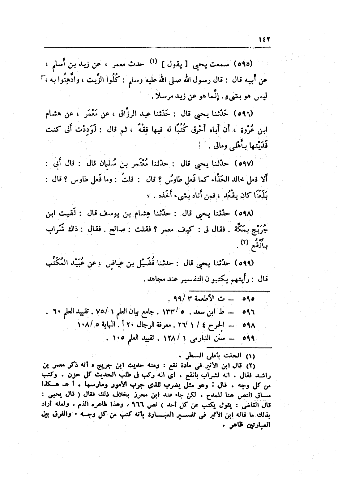 595 - سَمِعت يحيى يَقُول حدث معمر عَن زيد بن أسلم عَن أَبِيه قَالَ قَالَ رَسُول الله صلى الله عَلَيْهِ وَسلم كلوا الزَّيْت وادهنوا بِهِ لَيْسَ هُوَ بِشَيْء إِنَّمَا هُوَ عَن زيد مُرْسلا
