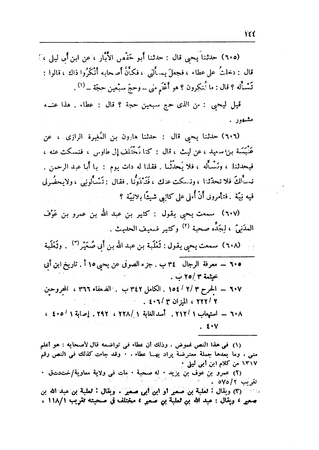 607 - سَمِعت يحيى يَقُول كثير بن عَمْرو بن عَوْف الْمدنِي لجده صُحْبَة وَكثير ضَعِيف الحَدِيث