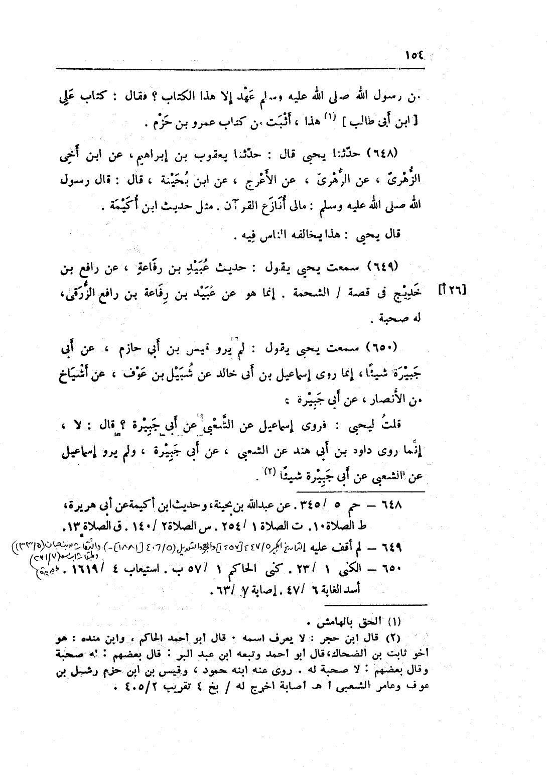 650 - سَمِعت يحيى يَقُول لم يرو قيس بن أَبى حَازِم عَن أَبى جبيرَة شَيْئا إِنَّمَا روى إِسْمَاعِيل بن أَبى خَالِد عَن شبيل بن عَوْف عَن أَشْيَاخ من الْأَنْصَار عَن أَبى جبيرَة قلت ليحيى فروى إِسْمَاعِيل عَن الشّعبِيّ عَن أَبى جبيرَة قَالَ لَا إِنَّمَا روى دَاوُد بن أَبى هِنْد عَن الشعبى عَن أَبى جبيرَة وَلم يرو إِسْمَاعِيل عَن الشّعبِيّ عَن أَبى جبيرَة شَيْئا
