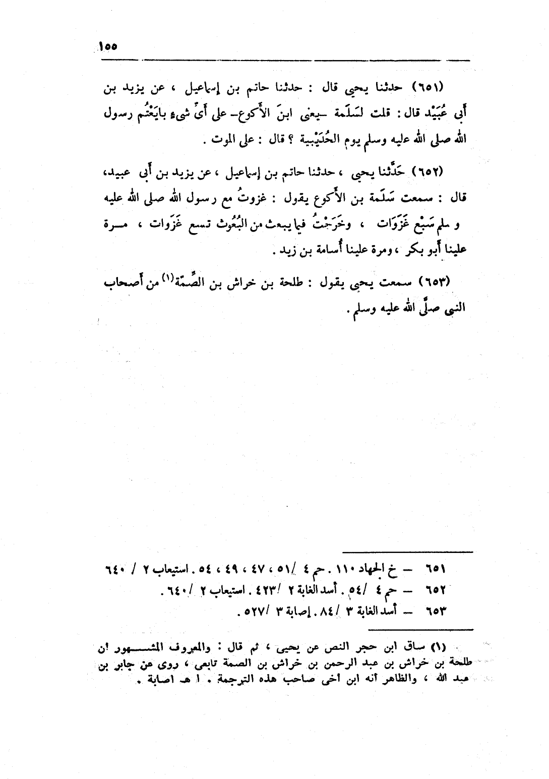 653 - سَمِعت يحيى يَقُول طَلْحَة بن خرَاش بن الصمَّة من أَصْحَاب النَّبِي صلى الله عَلَيْهِ وَسلم
