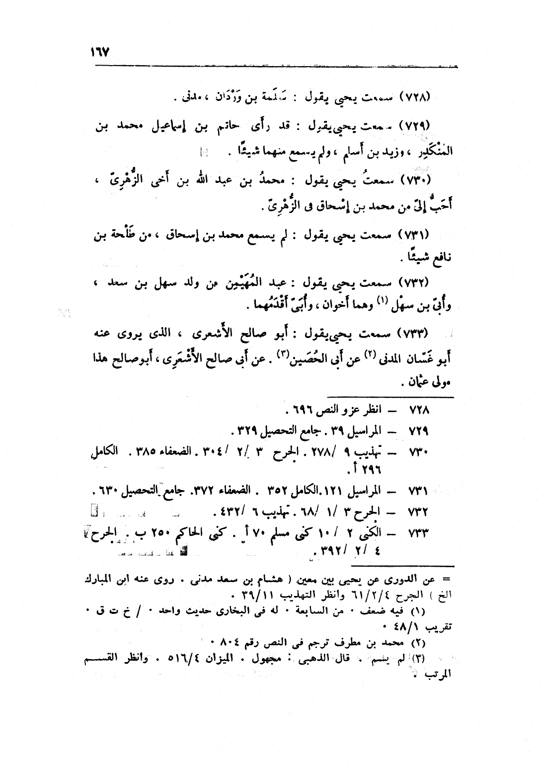 729 - سَمِعت يحيى يَقُول قد رأى حَاتِم بن إِسْمَاعِيل مُحَمَّد بن الْمُنْكَدر وَزيد بن أسلم وَلم يسمع عَنْهُمَا شَيْئا