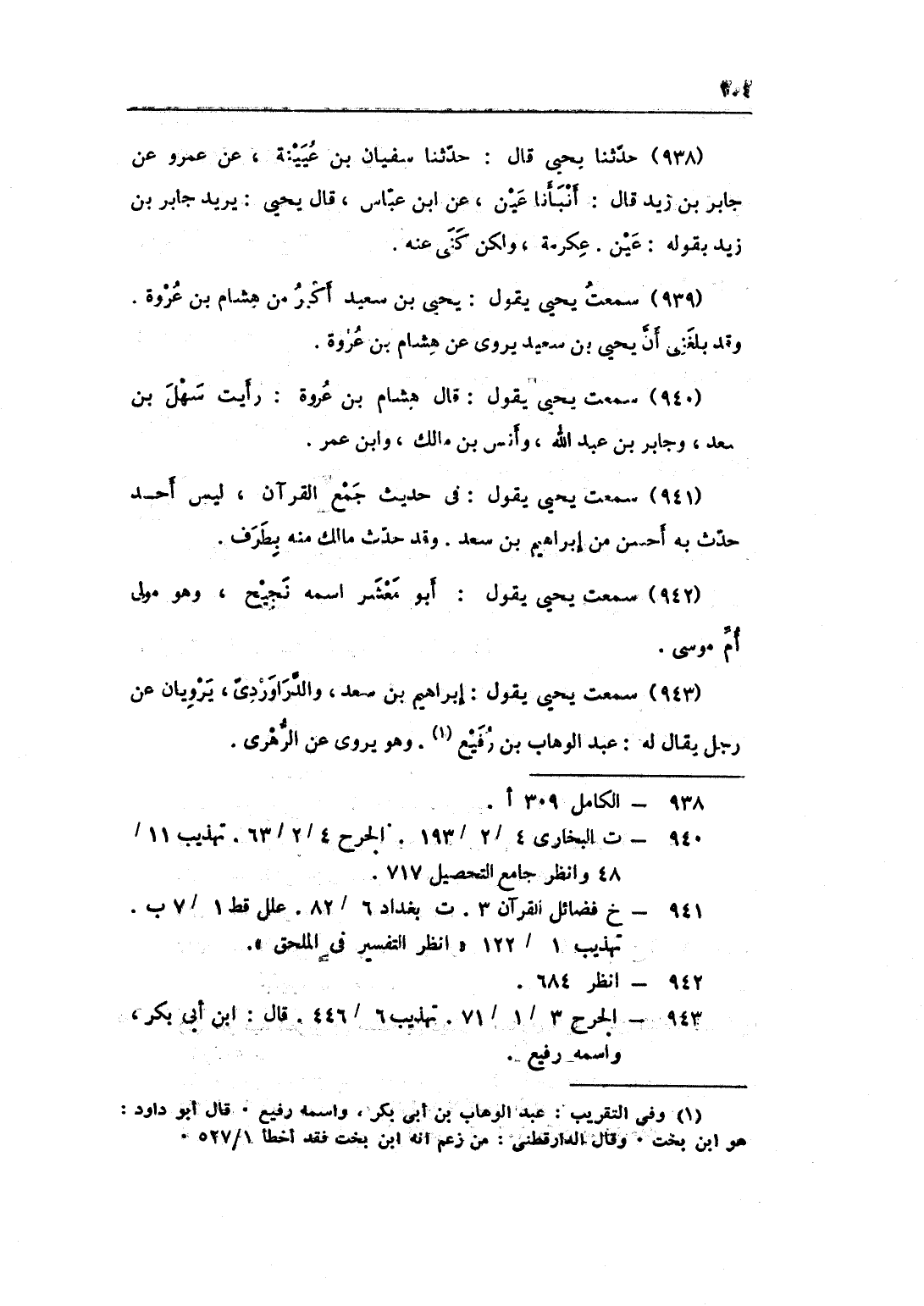 943 - سَمِعت يحيى يَقُول إِبْرَاهِيم بن سعد الدَّرَاورْدِي يرويان عَن رجل يُقَال لَهُ عبد الْوَهَّاب بن رفيع وَهُوَ يرْوى عَن الزهرى