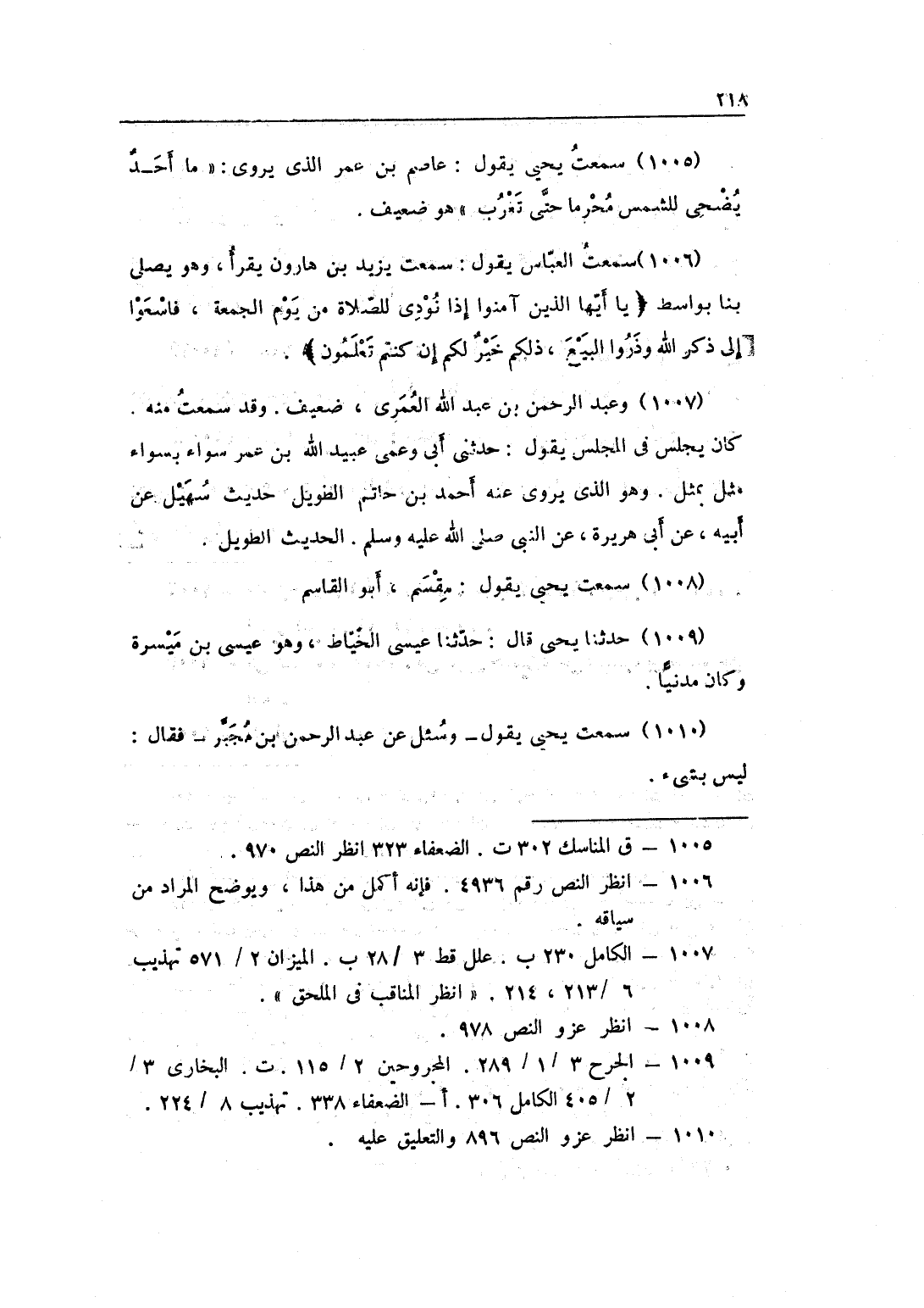 1005 - سَمِعت يحيى يَقُول عَاصِم بن عمر الَّذِي يرْوى مَا أحد يضحى للشمس محرما حَتَّى تغرب هُوَ ضَعِيف