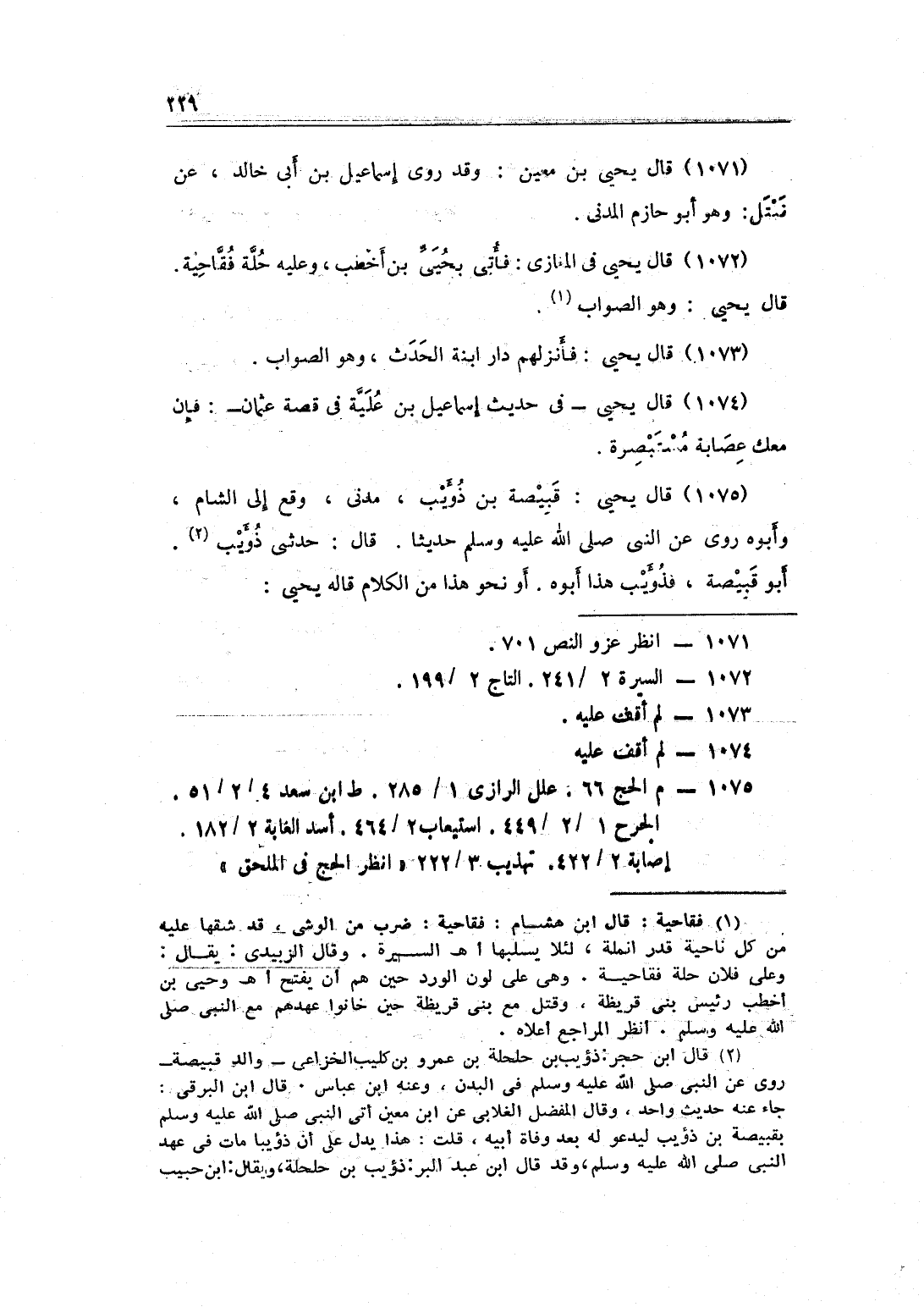 1075 - قَالَ يحيى قبيصَة بن ذُؤَيْب مدنِي وَقع إِلَى الشَّام وَأَبوهُ روى عَن النَّبِي صلى الله عَلَيْهِ وَسلم حَدِيثا قَالَ حَدثنِي ذُؤَيْب أَبُو قبيصَة فذؤيب هَذَا أَبوهُ أَو نَحْو هَذَا من الْكَلَام قَالَه يحيى