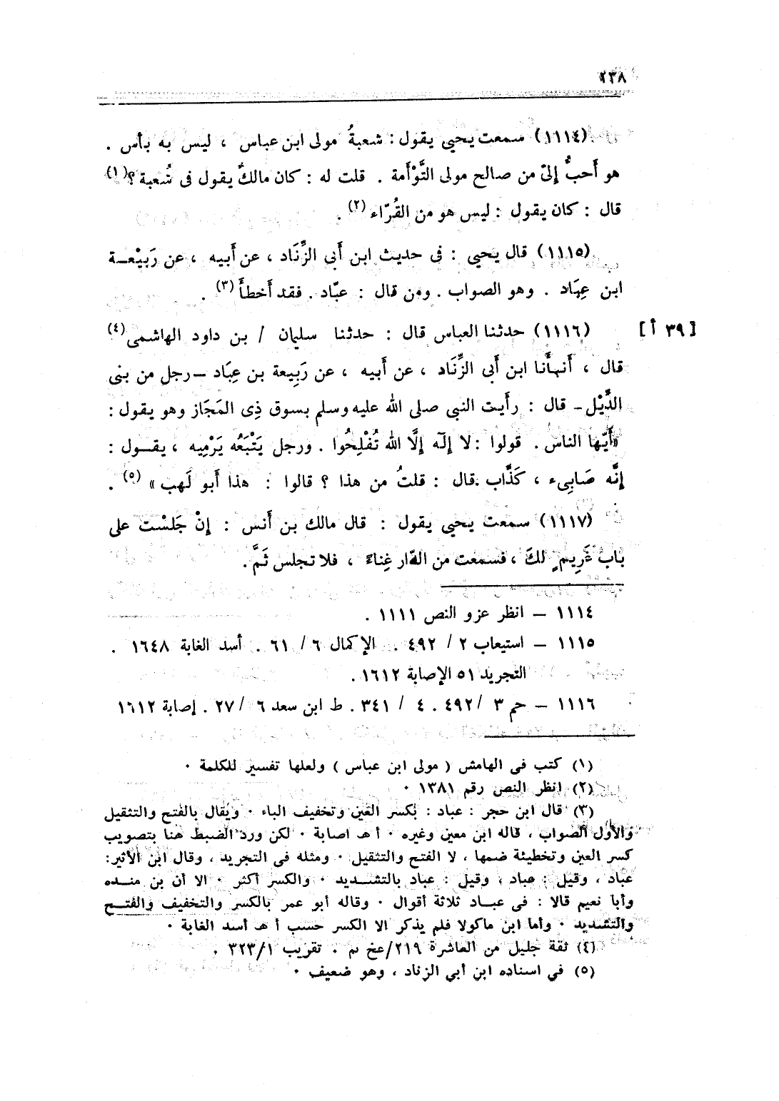 1114 - سَمِعت يحيى يَقُول شُعْبَة مولى بن عَبَّاس لَيْسَ بِهِ بَأْس هُوَ أحب إِلَى من صَالح مولى التَّوْأَمَة قلت لَهُ كَانَ مَالك يَقُول فِي شُعْبَة لَيْسَ هُوَ من الْقُرَّاء