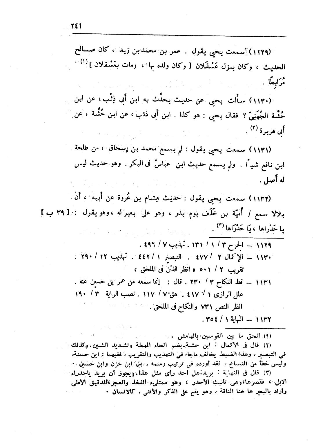 1132 - سَمِعت يحيى يَقُول حَدِيث هِشَام بن عُرْوَة عَن أَبِيه أَن بِلَالًا سمع أُميَّة بن خلف يَوْم بدر وَهُوَ على بِغَيْر لَهُ وَهُوَ يَقُول يَا حدراها يَا حدراها قَالَ يحيى قَالَ أَبُو عُبَيْدَة الْبَصْرِيّ يُرِيد هَل أحد رأى مثل هَذَا هَل أَي رأى مثل هَذَا
