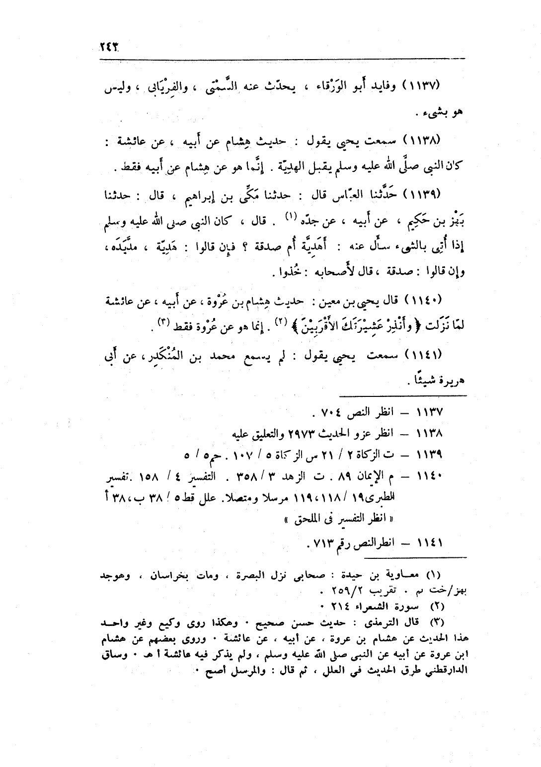 1138 - سَمِعت يحيى يَقُول حَدِيث هِشَام عَن أَبِيه عَن عَائِشَة كَانَ النَّبِي صلى الله عَلَيْهِ وَسلم يقبل الْهَدِيَّة إِنَّمَا هُوَ عَن هِشَام عَن أَبِيه فَقَط