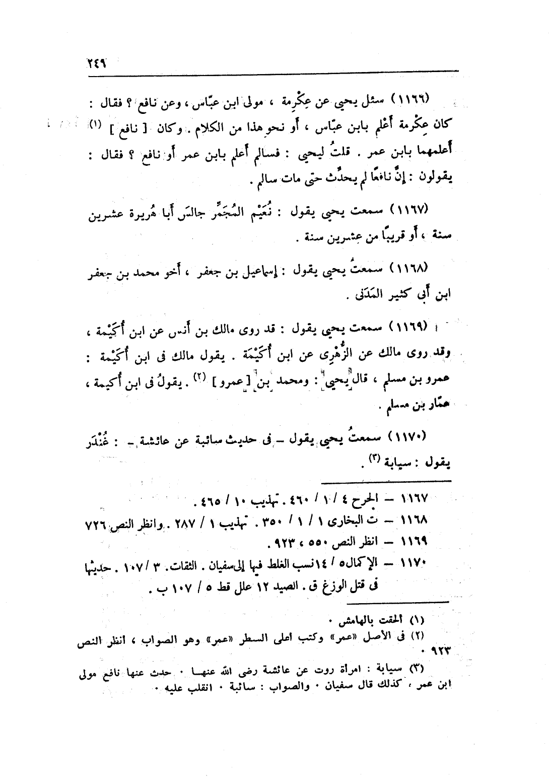 1166 - سُئِلَ يحيى عَن عِكْرِمَة مولى بن عَبَّاس وَعَن نَافِع فَقَالَ كَانَ عِكْرِمَة أعلم بِابْن عَبَّاس أَو نَحْو هَذَا من الْكَلَام وَكَانَ نَافِع أعلمهما بِابْن عمر قلت ليحيى فسالم أعلم بِابْن عمر أَو نَافِع فَقَالَ يَقُولُونَ إِن نَافِعًا لم يحدث حَتَّى مَاتَ سَالم