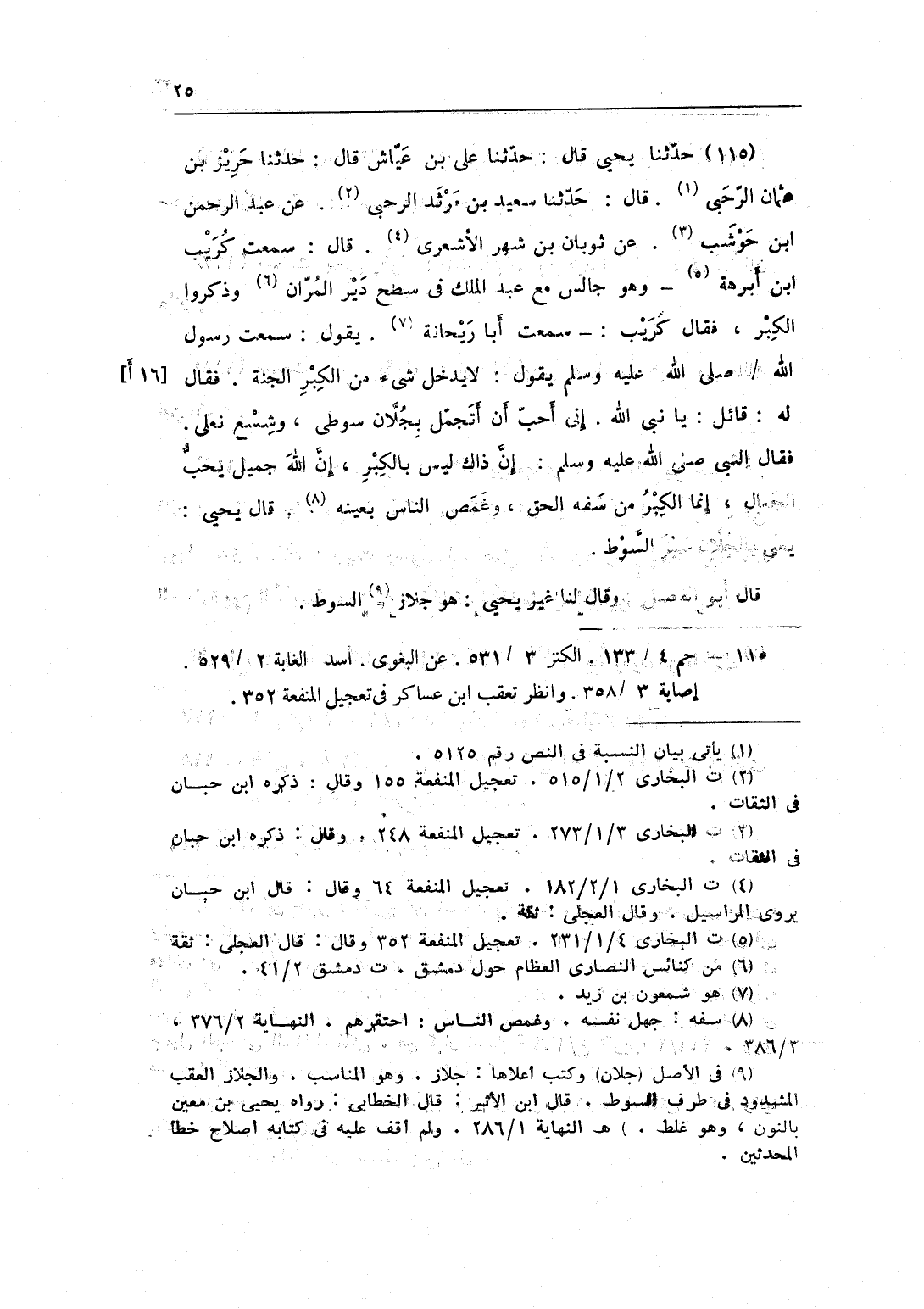 115 - حَدثنَا يحيى قَالَ حَدثنَا على بن عَيَّاش قَالَ حَدثنَا حريز بن عُثْمَان الرَّحبِي قَالَ حَدثنَا سعيد بن مرْثَد الرَّحبِي عَن عبد الرَّحْمَن بن حَوْشَب عَن ثَوْبَان بن شهر الْأَشْعَرِيّ قَالَ سَمِعت كريب بن أَبْرَهَة وَهُوَ جَالس مَعَ عبد الْملك فِي سطح دير المران وَذكروا الْكبر فَقَالَ كريب سَمِعت أَبَا رَيْحَانَة يَقُول سَمِعت رَسُول الله صلى الله عَلَيْهِ وَسلم يَقُول لَا يدْخل شَيْء من الْكبر الْجنَّة فَقَالَ لَهُ قَائِل يَا نَبِي الله إِنِّي أحب أَن أَتَجَمَّل بجلان سوطى وَشسع نعلى فَقَالَ النَّبِي صلى الله عَلَيْهِ وَسلم إِن ذَاك لَيْسَ بِالْكبرِ إِن الله جميل يحب الْجمال إِنَّمَا الْكبر من سفه الْحق وَغَمص النَّاس بِعَيْنِه قَالَ يحيى يَعْنِي بالجلان سير السَّوْط قَالَ أَبُو الْفضل وَقَالَ لنا غير يحيى هُوَ جلاز السَّوْط